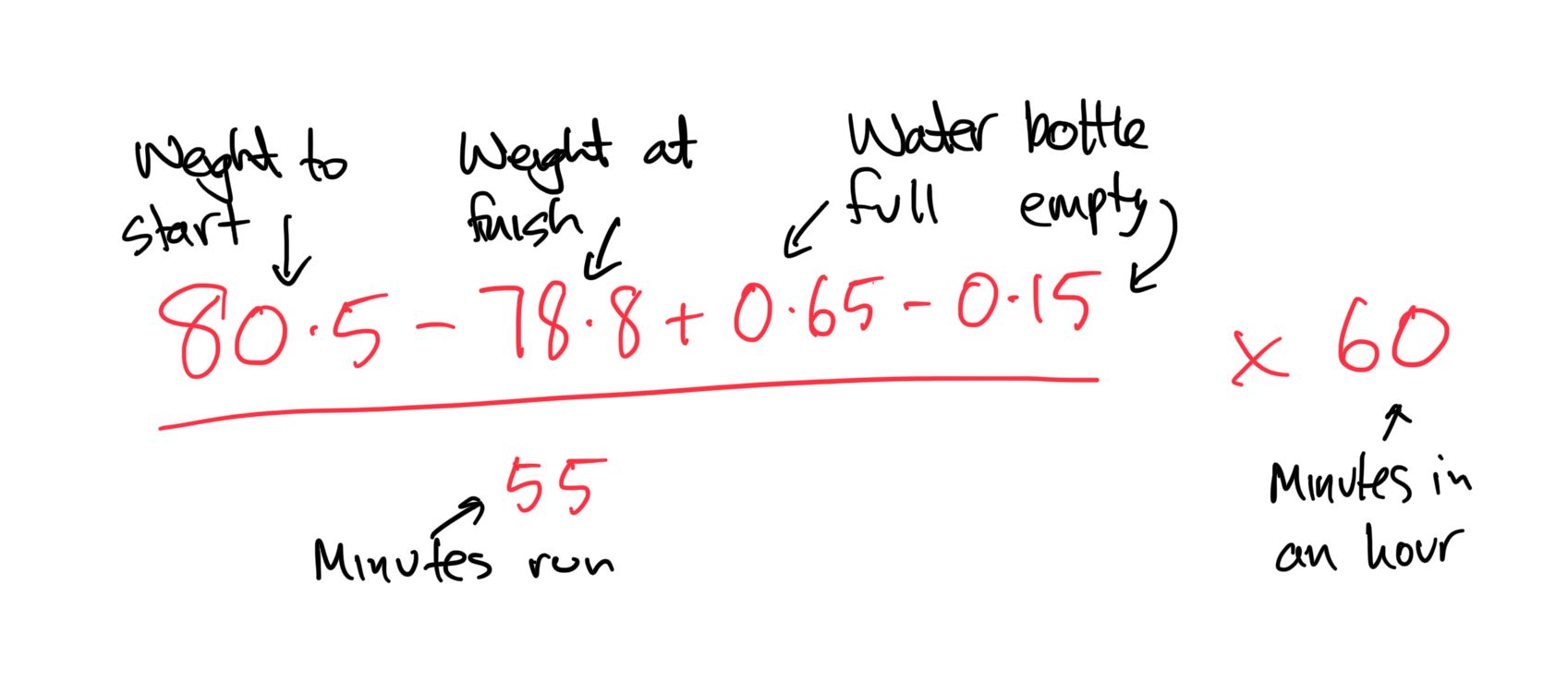 The task now is to figure out total weight prior to running, and total weight after running, taking account of any fluid you’ve taken on board during the run (noting 1 millilitre of water equals near enough to 1 gram, so 1L=1kg).