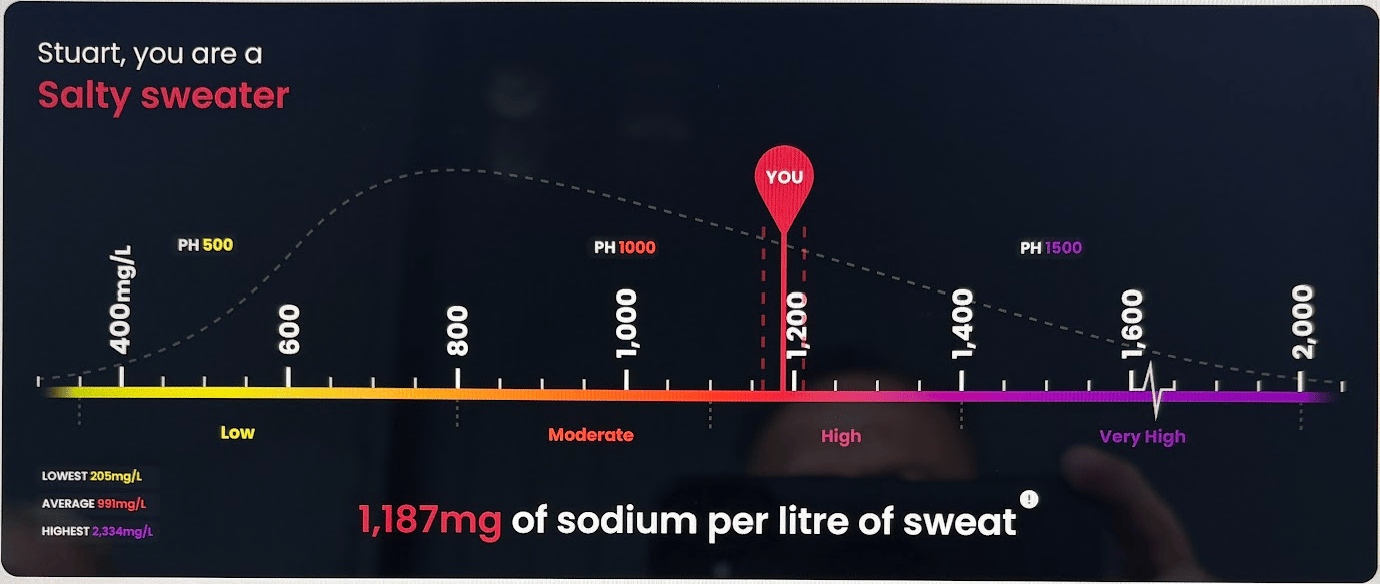 So the volume of sweat we lose is one variable. Another is the sodium concentration of our sweat - essentially how “salty” a sweater you are. Once you’ve nailed down those variables, you can come up with a plan to replace enough of the water, sodium and chloride you lose.